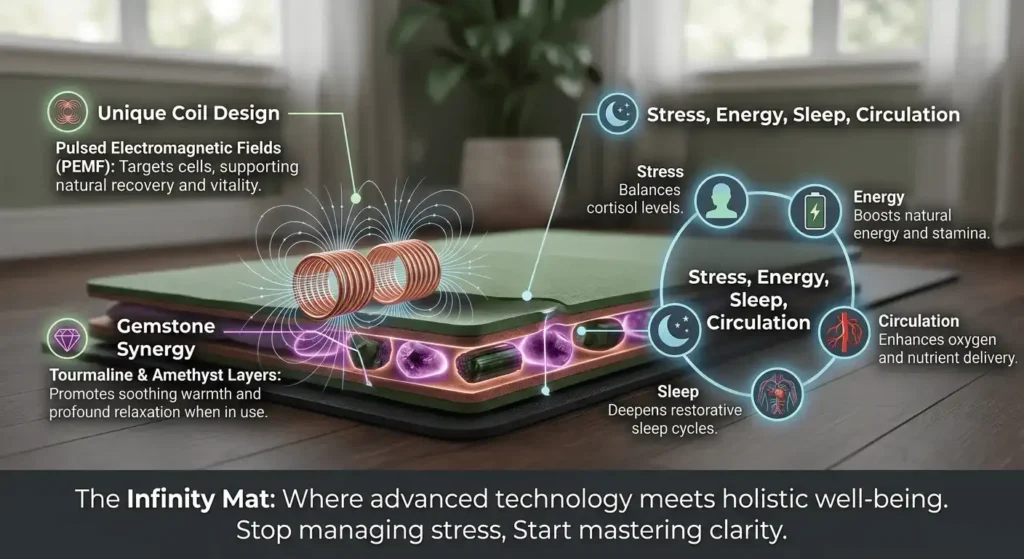 The Infinity Mat may offer a range of wellness benefits, including helping to reduce stress, ease muscle tension, improve circulation, and support relaxation. It may also assist with better sleep, increased energy, and overall recovery, making it a helpful addition to a daily wellness routine.